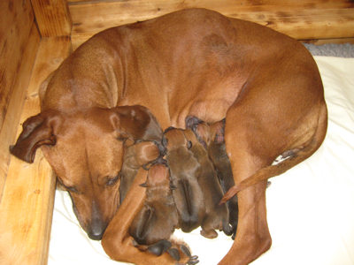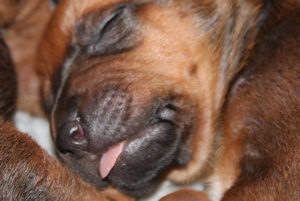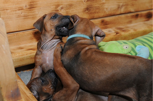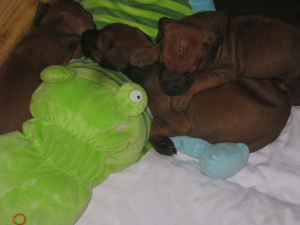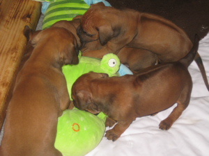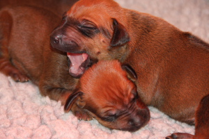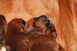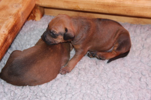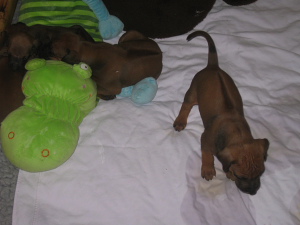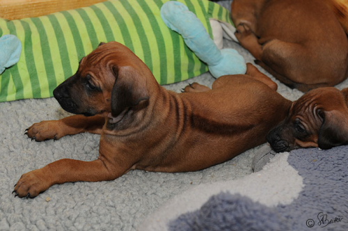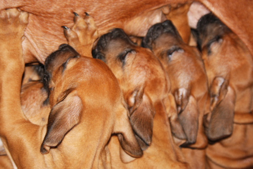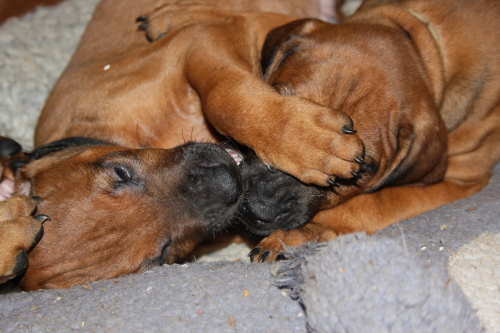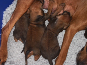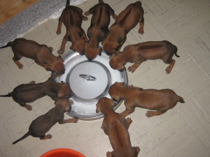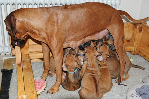 13.01.2011 - Nun sind die kleinen Vielfresser schon so groß, dass ihnen Cosi`s Milch und das Fläschchen zusätzlich nicht mehr reicht, nein jetzt wollen sie in Milch regelrecht baden!!! Die hellen Flecken, die man teilweise auf ihnen sieht, sind Überreste der Milchbäder. Wenn sie satt sind, kämpfen sie mit großen „Untieren“, räkeln sich gemütlich in der Ecke der Wurfkiste oder nehmen noch eine Sonderration bei Mama. So wie die Kleinsten, die hierbei immer etwas bevorzugt werden.