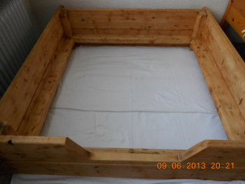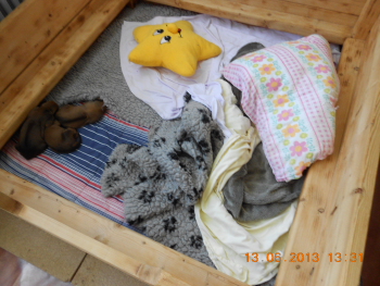 So sieht 3x am Tag die Wurfiste aus: Fünffach gepolstert, saubere Laken und alles straff gezogen und fest geklemmt...und das macht dann Dusty innerhalb weniger Sekunden daraus.